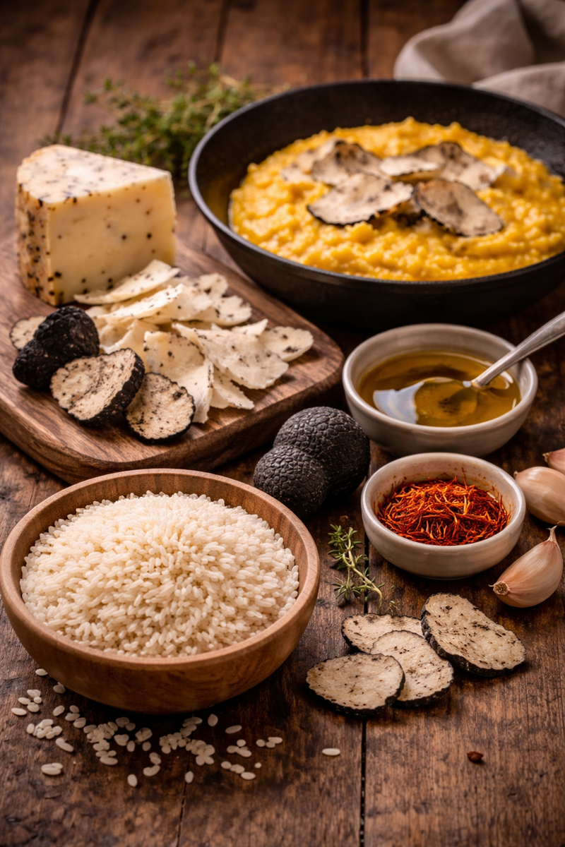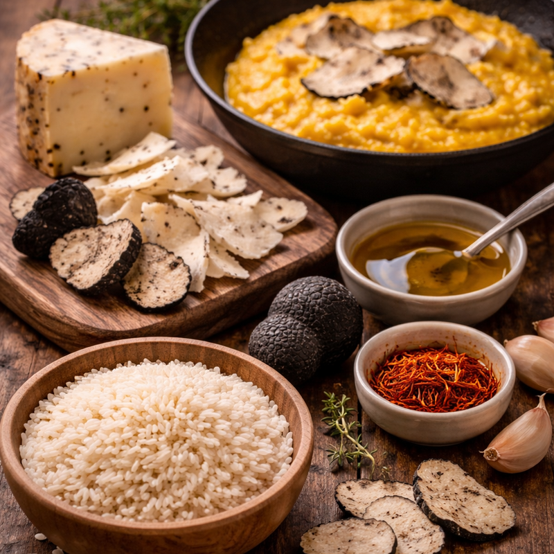 Risotto allo zafferano impreziosito da scaglie di pecorino al tartufo nero Risotto au safran rehaussé de fines lamelles de pecorino à la truffe noire | 32.00 |